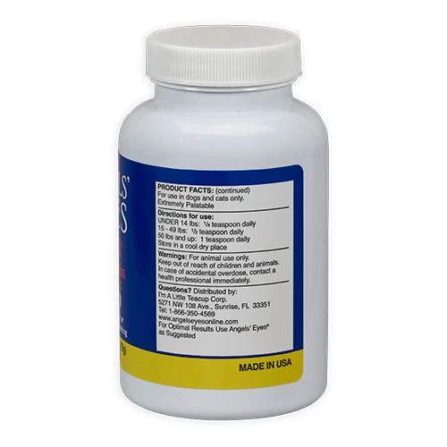 Special all natural enhanced anti-tear stain formula specifically developed for both dogs and cats for unsightly tear stains from the inside out! Angels’ Eyes PLUS never adds food dyes, wheat, corn, or soy which may have negative effects on your pet. Our bottles contain net contents 1.59 oz (45 grams), 2.64 oz (75 grams net). Recommended for both Shedding and Non-shedding Breeds. Extremely Palatable