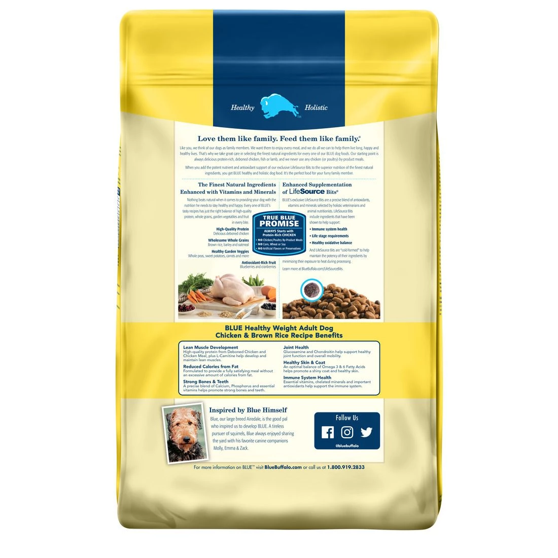 Without extra calories from fat, BLUE Life Protection Formula Healthy Weight Dry Dog Food is formulated to help dogs achieve and maintain a healthy weight. It contains the ingredients you’ll love feeding as much as they’ll love eating. BLUE Life Protection Formula dog food is a product of the Blue Buffalo company. Based in the United States, Blue Buffalo makes premium-quality pet foods featuring real meat, fruit and vegetables.