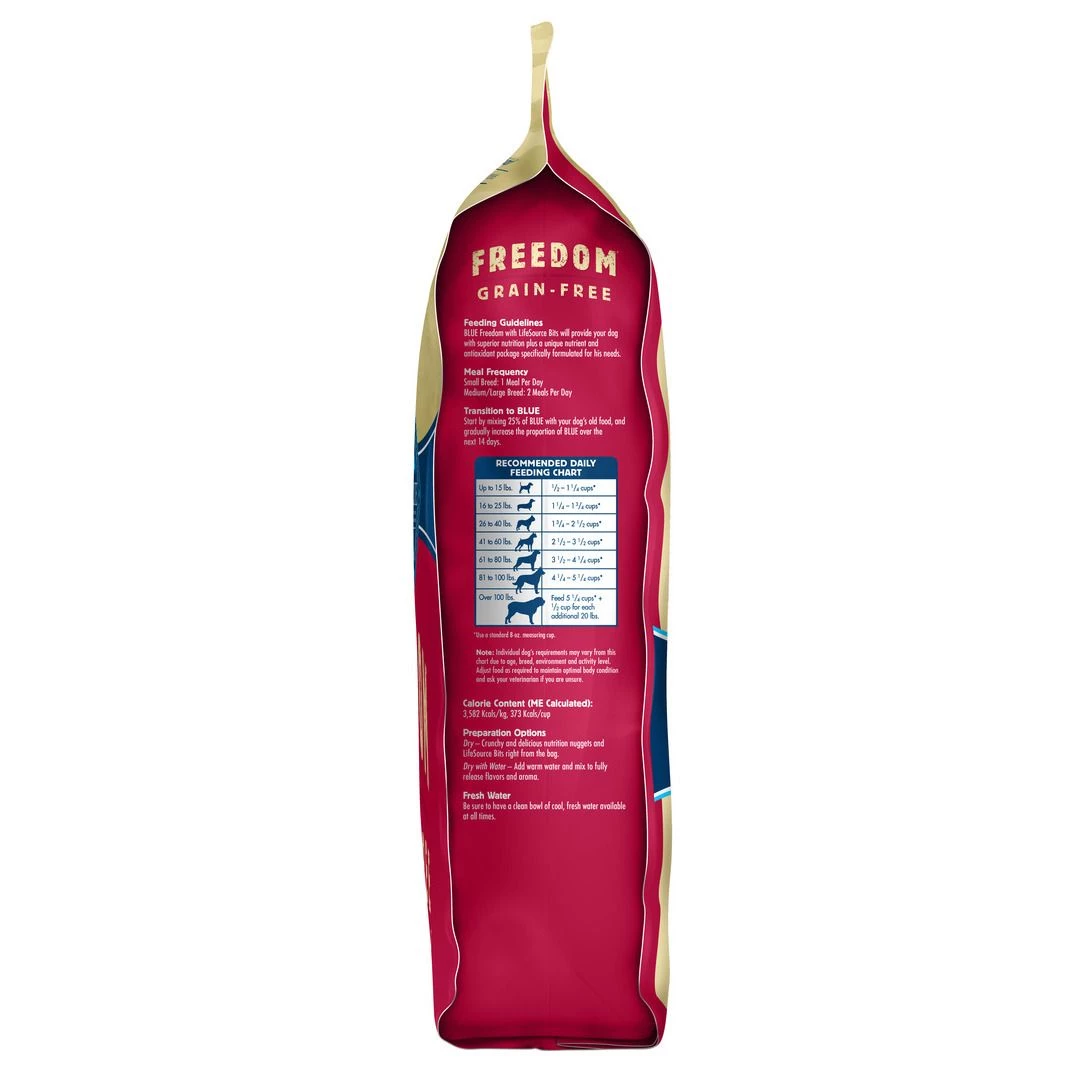 BLUE Freedom is a delicious, 100% grain free formula that contains no gluten. All BLUE Freedom dog food recipes feature high-quality real meat with no chicken (or poultry) by-product meals. Set your dog free from grains with this tasty, satisfying diet. BLUE Freedom dog food is a product of the Blue Buffalo company. Based in the United States, Blue Buffalo makes premium-quality pet foods featuring real meat, fruit and vegetables.