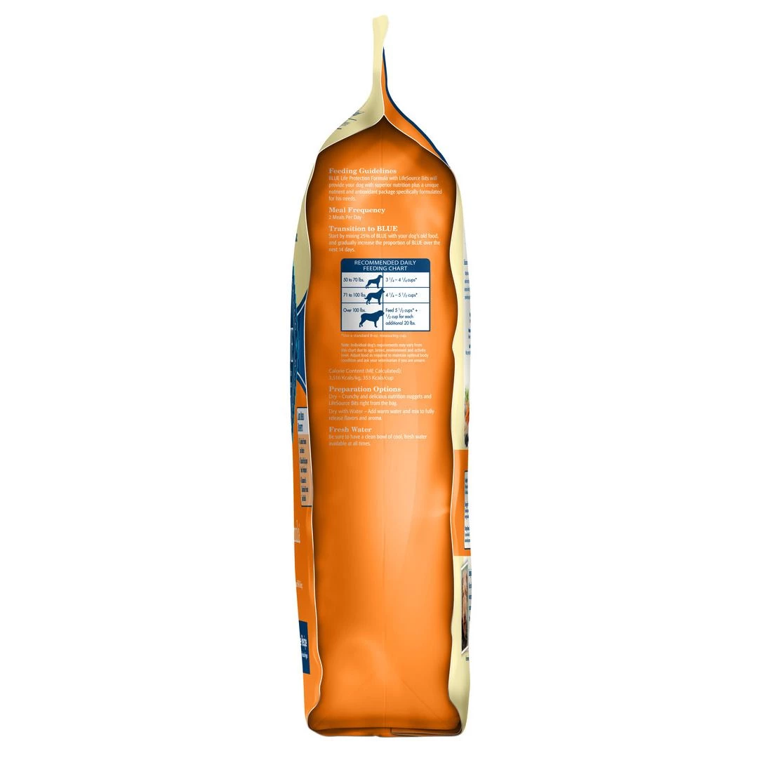 BLUE Life Protection Formula dog food for Large Breed Dogs contains glucosamine and chondroitin to help support the special needs of bigger dogs. It contains the ingredients you’ll love feeding as much as they’ll love eating. BLUE Life Protection Formula dog food is a product of the Blue Buffalo company. Based in the United States, Blue Buffalo makes premium-quality pet foods featuring real meat, fruit and vegetables.