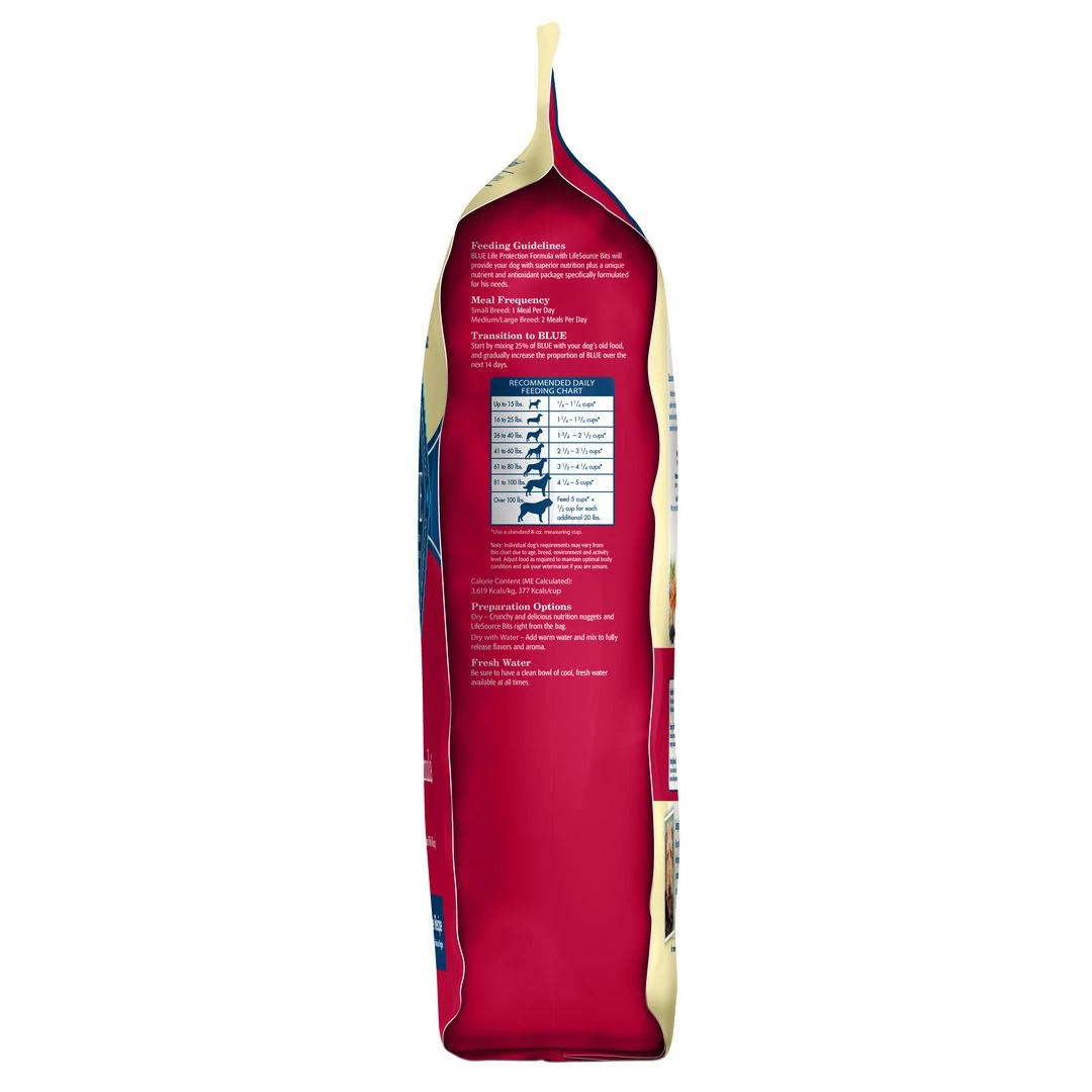 Formulated for the health and well-being of dogs, BLUE Life Protection Formula Dry Dog Food is made with the finest natural ingredients enhanced with vitamins and minerals. It contains the ingredients you’ll love feeding as much as they’ll love eating. BLUE Life Protection Formula dog food is a product of the Blue Buffalo company. Based in the United States, Blue Buffalo makes premium-quality pet foods featuring real meat, fruit and vegetables. Ingredients (In Detail ):Whitefish, Menhaden Fish Meal (source of Omega 3 Fatty Acids), Brown Rice, Barley, Oatmeal, Pea Starch, Peas, Chicken Fat (preserved with Mixed Tocopherols), Flaxseed (source of Omega 6 Fatty Acids), Natural Flavor, Chicken Meal, Dried Tomato Pomace, Pea Protein, Dehydrated Alfalfa Meal, Salt, Potassium Chloride, Calcium Carbonate, Potatoes, Dried Chicory Root, Pea Fiber, Alfalfa Nutrient Concentrate, Choline Chloride, DL-Methionine, Sweet Potatoes, Carrots, preserved with Mixed Tocopherols, Garlic, Glucosamine Hydrochloride, Zinc Amino Acid Chelate, Zinc Sulfate, Vegetable Juice for color, Ferrous Sulfate, Vitamin E Supplement, Iron Amino Acid Chelate, Blueberries, Cranberries, Barley Grass, Parsley, Turmeric, Dried Kelp, Yucca Schidigera Extract, Niacin (Vitamin B3), Calcium Pantothenate (Vitamin B5), L-Ascorbyl-2-Polyphosphate (source of Vitamin C), L-Lysine, Copper Sulfate, Biotin (Vitamin B7), L-Carnitine, Vitamin A Supplement, Copper Amino Acid Chelate, Manganese Sulfate, Taurine, Manganese Amino Acid Chelate, Thiamine Mononitrate (Vitamin B1), Riboflavin (Vitamin B2), Vitamin D3 Supplement, Vitamin B12 Supplement, Pyridoxine Hydrochloride (Vitamin B6), Calcium Iodate, Dried Yeast, Dried Enterococcus faecium fermentation product, Dried Lactobacillus acidophilus fermentation product, Dried Aspergillus niger fermentation extract, Dried Trichoderma longibrachiatum fermentation extract, Dried Bacillus subtilis fermentation extract, Folic Acid (Vitamin B9), Sodium Selenite, Oil of Rosemary.