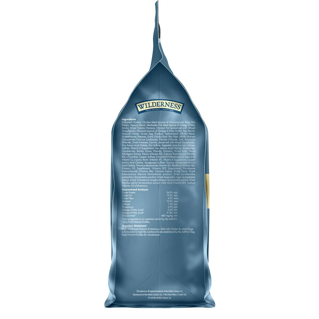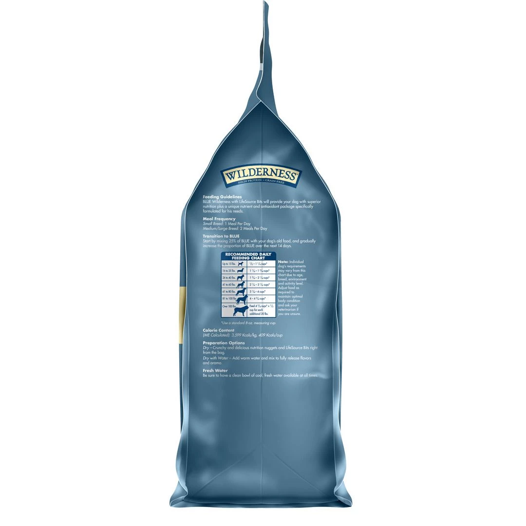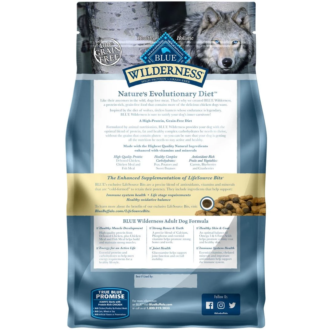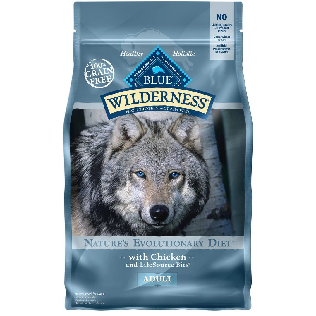 BLUE Wilderness natural dry dog food satisfies the spirit of the wolf in your canine with more of the meat dogs love. This high protein, grain free formula starts with delicious, protein-rich chicken, features antioxidant-rich LifeSource Bits and is enhanced with vitamins, minerals and other nutrients. Specially formulated for adult dogs, the high-quality protein plus complex carbohydrates from fruits and vegetables help support your dog’s energy needs.