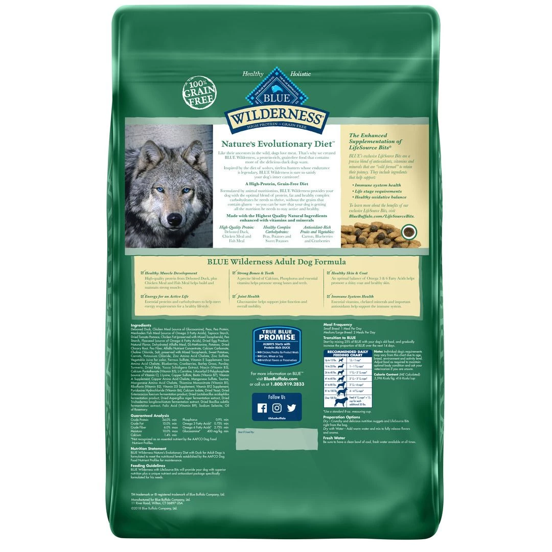 BLUE Wilderness natural dry dog food satisfies the spirit of the wolf in your canine with more of the meat dogs love. This high protein, grain free formula starts with delicious, protein-rich duck, features antioxidant-rich LifeSource Bits and is enhanced with vitamins, minerals and other nutrients. Specially formulated for adult dogs, the high-quality protein plus complex carbohydrates from fruits and vegetables help support your dog’s energy needs.