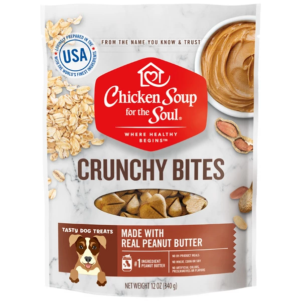 Chicken Soup for the Soul Crunchy Bites Peanut Butter Dog Treats provide your furry friend with a low-calorie snack that is not only nutritious but delicious too. These treats are easy-to-break and come in a heart shape to show your love for your pup. With only seven calories, they feature real peanut butter as the first ingredient and contain no by-product meals, corn, wheat, soy, artificial colors, preservatives or flavors. Made in the USA, Chicken Soup for the Soul Crunchy Bites Peanut Butter Dog are a great option as a reward or for training you paw-tner.