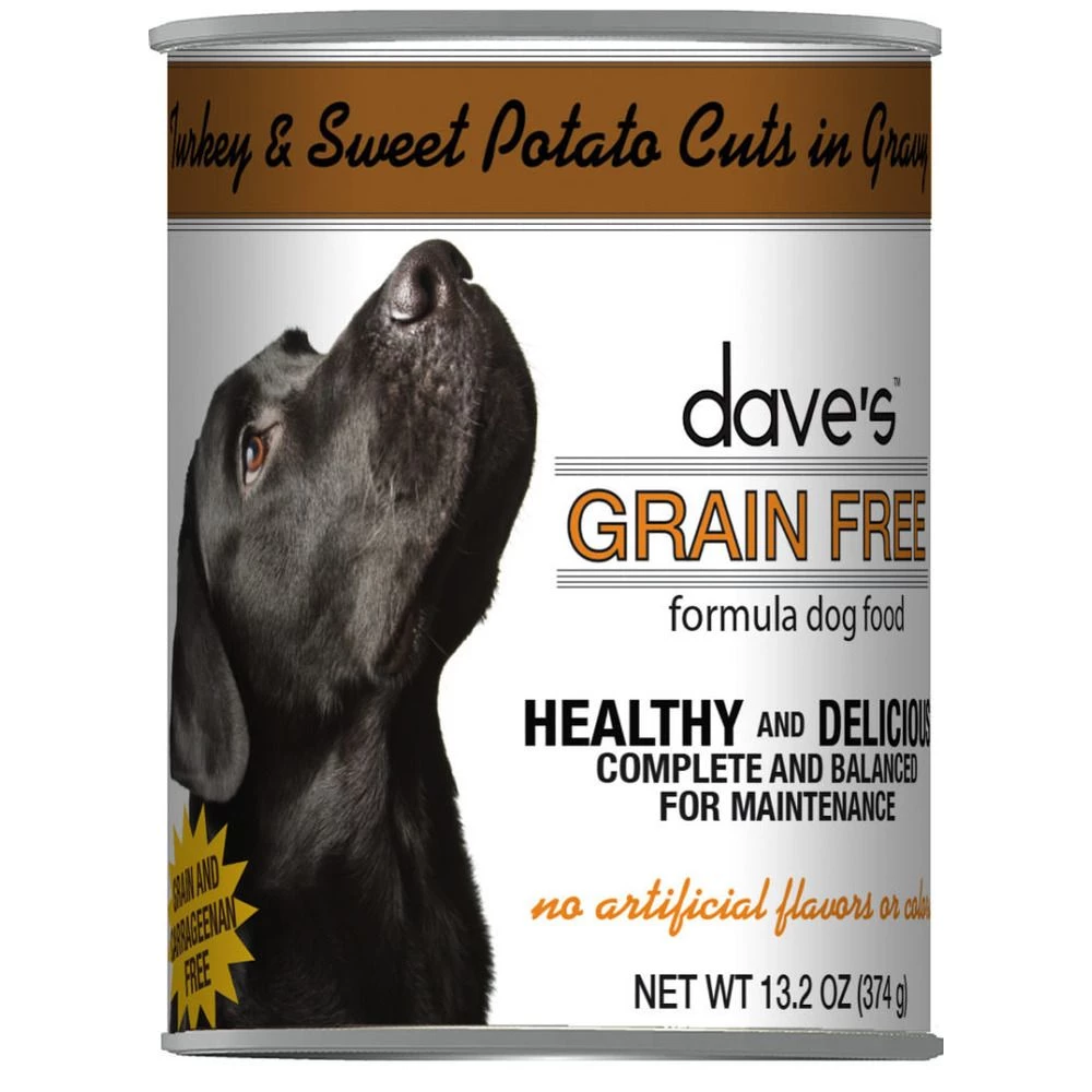 Dave’s Pet Food Turkey & Sweet Potato Canned Dog Food 13 oz Case of 12 Dave’s Grain Free Canned Dog Food Formulas are loaded with real meat and a great taste your dog will love! These are healthy, grain free, all natural diets with added vitamins and minerals, no artificial flavors or colors. Our selection of grain free options include savory flavors, like beef and vegetable cuts in gravy or pork and sweet potato; and lighter choices like flavors of the sea with salmon, ocean fish and vegetables in gravy. This product is formulated to meet the nutritional levels established by the AAFCO Dog Food nutrient profiles.