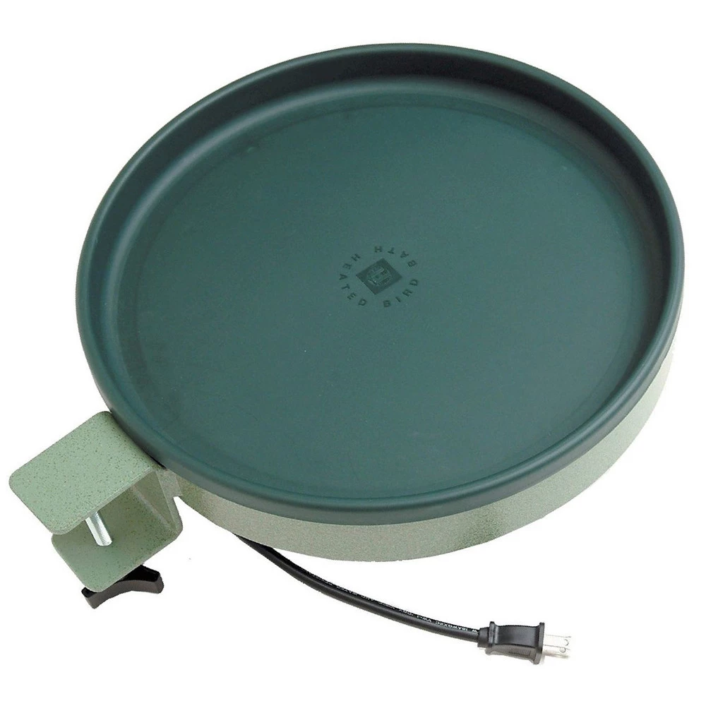 - Includes hardware for three different mounting options: deck/post mount, clamp mount and legs for ground placementThermostatically controlled birdbath operates only when necessary, costing just pennies a day to operateCord tucks away for warm weather use, hidden from sightPowder coated finish will remain rust free for yearsTested to -10øF (-23øC)Plastic basin in terra cotta color lifts out easily for cleaning