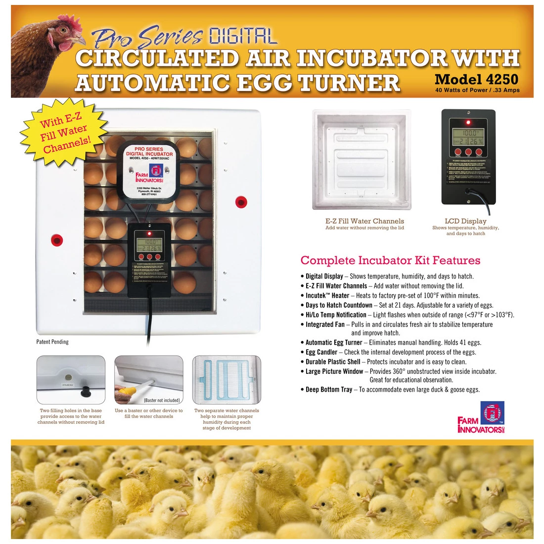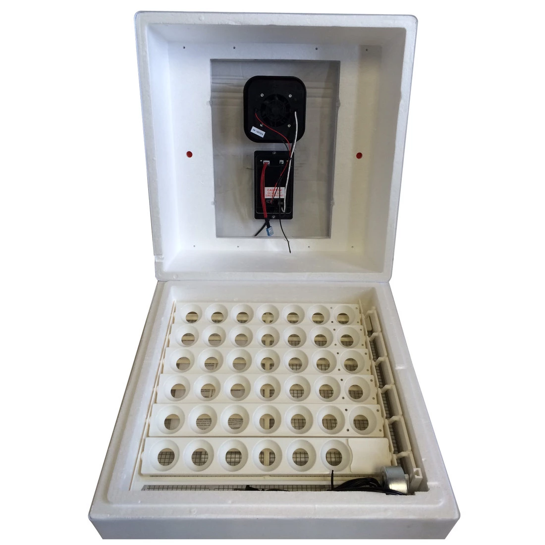 - Durable hard plastic outer shell protects incubator and is easy to cleanAutomatic egg turner turns the eggs completely every 4 hours to eliminate manual handling and improve hatch rate (41 egg capacity)An integrated fan pulls in and circulates fresh air to stabilize temperature and improve hatchAn easy to read digital display shows temperature, humidity, and days to hatch (adjustable for a variety of eggs)High/low temperature notification light flashes when temperature is below 97øF or above 103øFIncludes egg candler to monitor development progress of the eggsLarge picture window provides a 360ø unobstructed view inside the incubator