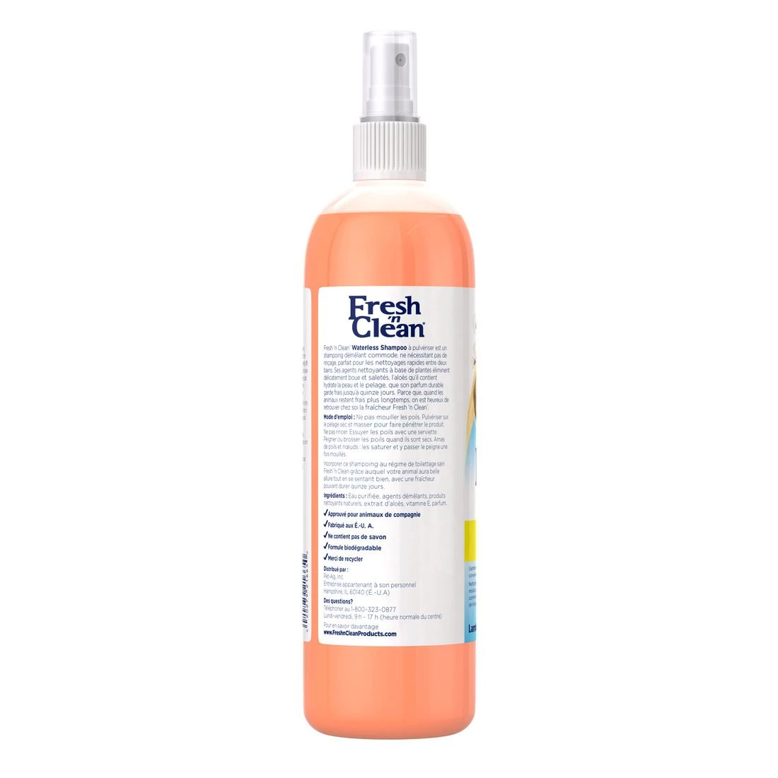 Give your dog a quick, rinse-free cleanup between baths with Fresh n Clean Waterless Shampoo. The soap-free formula uses natural plant-based cleansing agents to gently lift away dirt and grime from your pets skin and coat without the need for water. Made with skin-soothing Aloe vera extract, it also works to release mats and tangles. Its the perfect solution to keep your pet clean when youre away from home. The Fresh n Clean signature, long-lasting scent keeps your dog smelling fresh up to two weeks.