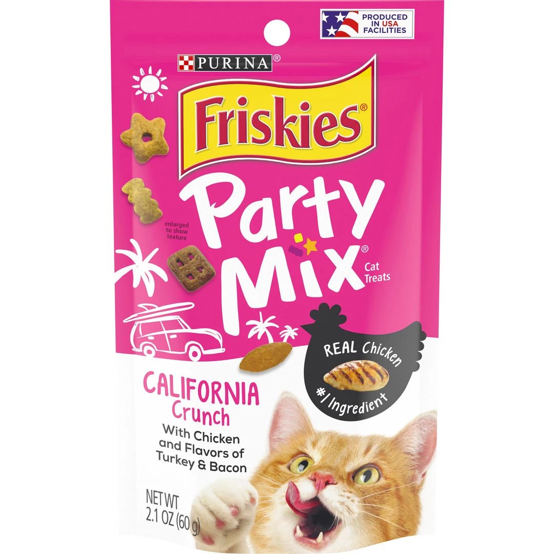 Show your cat companion that she’s the leading lady in your life when you offer up Purina Friskies Party Mix California Crunch adult cat treats. With high-quality ingredients in every bite, these nutritious treats ensure your feline friend always feels ready for the red carpet. Whether it’s playtime or you’re sharing a snuggle with your little diva, feed her a few of these Purina Friskies Party Mix adult cat treats to show her just how much you adore her. Every bite-sized treat provides 100% complete and balanced nutrition for adults cats, allowing you to offer between-meal snacks without compromising her healthy diet. On days when you serve her a few extra treats, simply reduce the amount of food you serve at meals to help maintain her optimal weight and health. Let the delectable flavor of real chicken, along with turkey and bacon accents, delight her time and time again. When you feel like flipping the script and giving her some variety at snack time, try one of our other exciting Purina Friskies Party Mix recipes, including Purina Friskies Party Mix Meow Luau Crunch adult cat treats for those times when she’s craving a tropical taste sensation or Purina Friskies Party Mix Treasure Island Crunch adult cat treats when she’s feeling adventurous. Your cat is a VIP, and we know how important it is for pet parents like you to feed their beloved pets the best. At Purina, we produce a complete line of wet and dry cat foods, cat complements and cat treats, giving you plenty of options to delight your special friend. We put the spotlight on quality, making sure to perform regular quality and safety checks throughout the manufacturing process. Crafted in US facilities for added peace of mind, our Purina recipes are backed by more than 90 years of innovation pushing pet nutrition forward. Make sure your cat always knows she’s the star of your show when you feed her Purina Friskies Party Mix California Crunch adult cat treats.