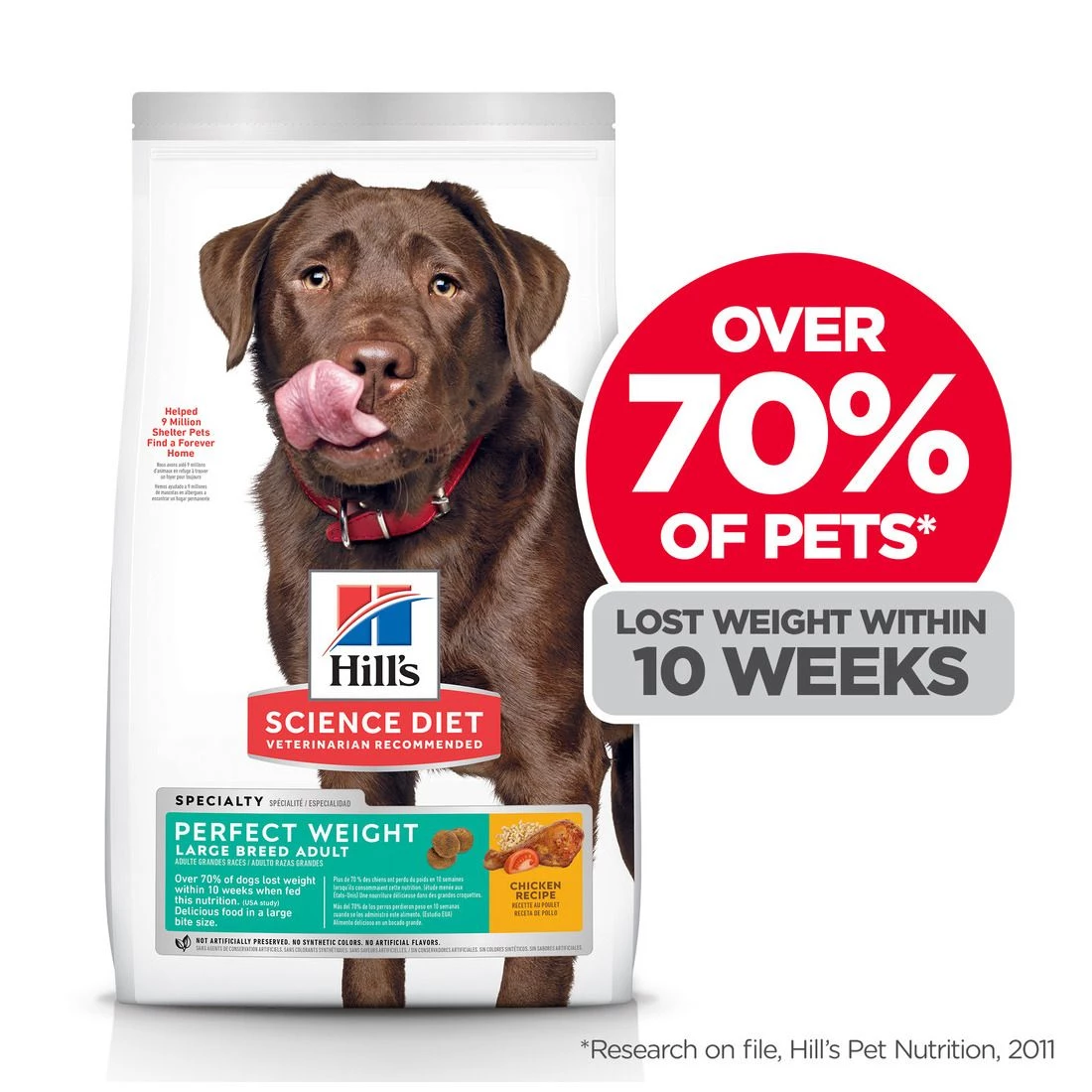 This weight management dog food was created with Hills unique understanding of the biology of overweight dogs. Over 70% of dogs lost weight within 10 weeks with Science Diet Perfect Weight dry dog food and now it comes in a larger kibble for large breed dogs. Feed this breakthrough nutrition for your large breed dogs healthy weight maintenance and long-lasting weight support.