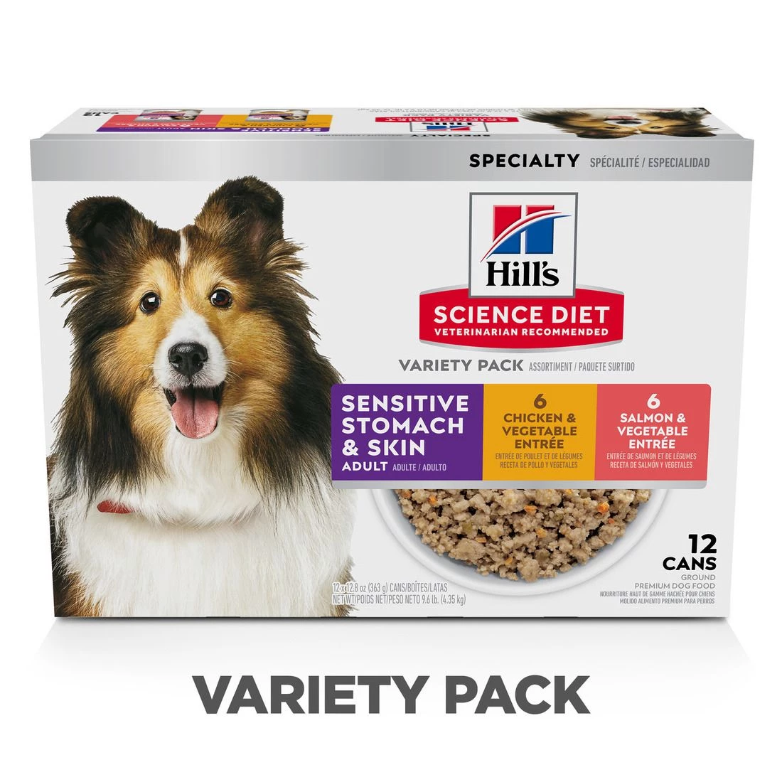 Support your dogs stomach and skin health plus make their mealtime delicious at the same time with the two flavors in this Science Diet Sensitive Stomach & Skin variety pack. Made in the USA with global ingredients you can trust, both flavors of this tasty dog food support digestive health, nourish skin and promote a lustrous coat. Open up a can and serve either one of these mouthwatering entrees as a balanced meal, or try on top of Science Diet dry dog food. Nutrition for adult dogs to help support optimal digestive and skin health. Variety pack of 12 cans of dog food in two delicious flavors. Easy-to-digest ingredients for healthy digestion and easier stool pick up. Vitamins and fatty acids for skin nourishment. Promotes a lustrous coat. The #1 Veterinarian Recommended pet food brand