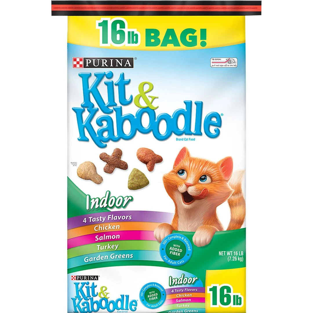 Have fun watching your cat scamper to her dish whenever you reach for a package of Purina Kit & Kaboodle Indoor adult dry cat food. This complete and balanced meal for adult indoor cats contains added fiber in every delectable serving, giving you just one more reason to choose it for your favorite feline. The four crunchy kibble shapes capture her attention and encourage her to play and paw at her food a little while she nibbles. Give your cat something to look forward to throughout the day when you make this recipe her go-to meal option. Follow the feeding instructions found on the packaging based on your cat’s weight, and adjust the portion size as needed to help her maintain an ideal body condition.