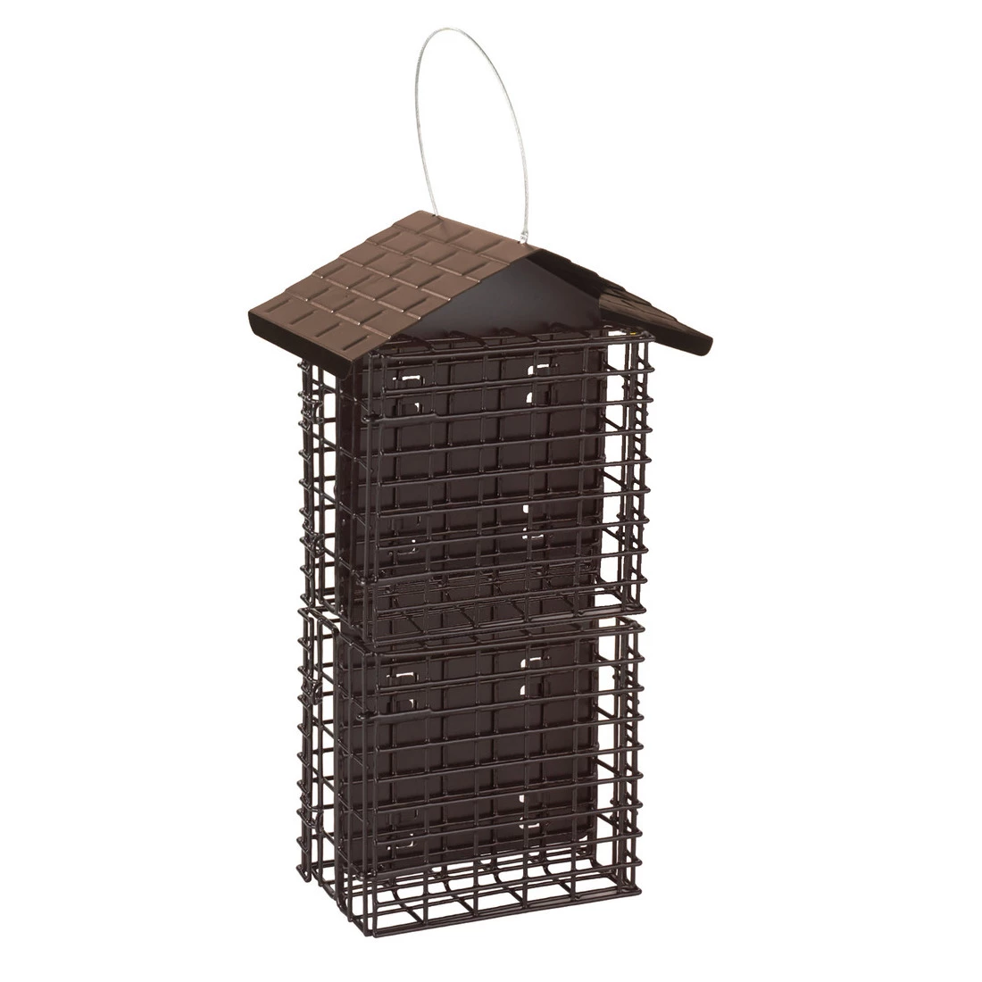 The More Birds^ Four Cake Suet Buffet with Weather Guard is the perfect way to offer healthy treats to Woodpeckers, Nuthatches, Chickadees and more! 4 independent cages hold 1 suet cake each, providing more feeding space for clinging birds. The cages feature an easy-open, double-locking closure system, and Woodpeckers use the bottom cages as a tail-prop when feeding! The shingle-patterned roof design diverts rain & snow, helping keep suet cakes dry. Its cage grid is designed with clinging birds in mind, but it’s not just for suet! It’s also perfect for small seed cakes, nesting materials in spring & oranges in summer. Constructed of solid steel with a weather resistant, black powder coated finish, the Four Cake Suet Buffet is a quality suet feeder that birds will love.