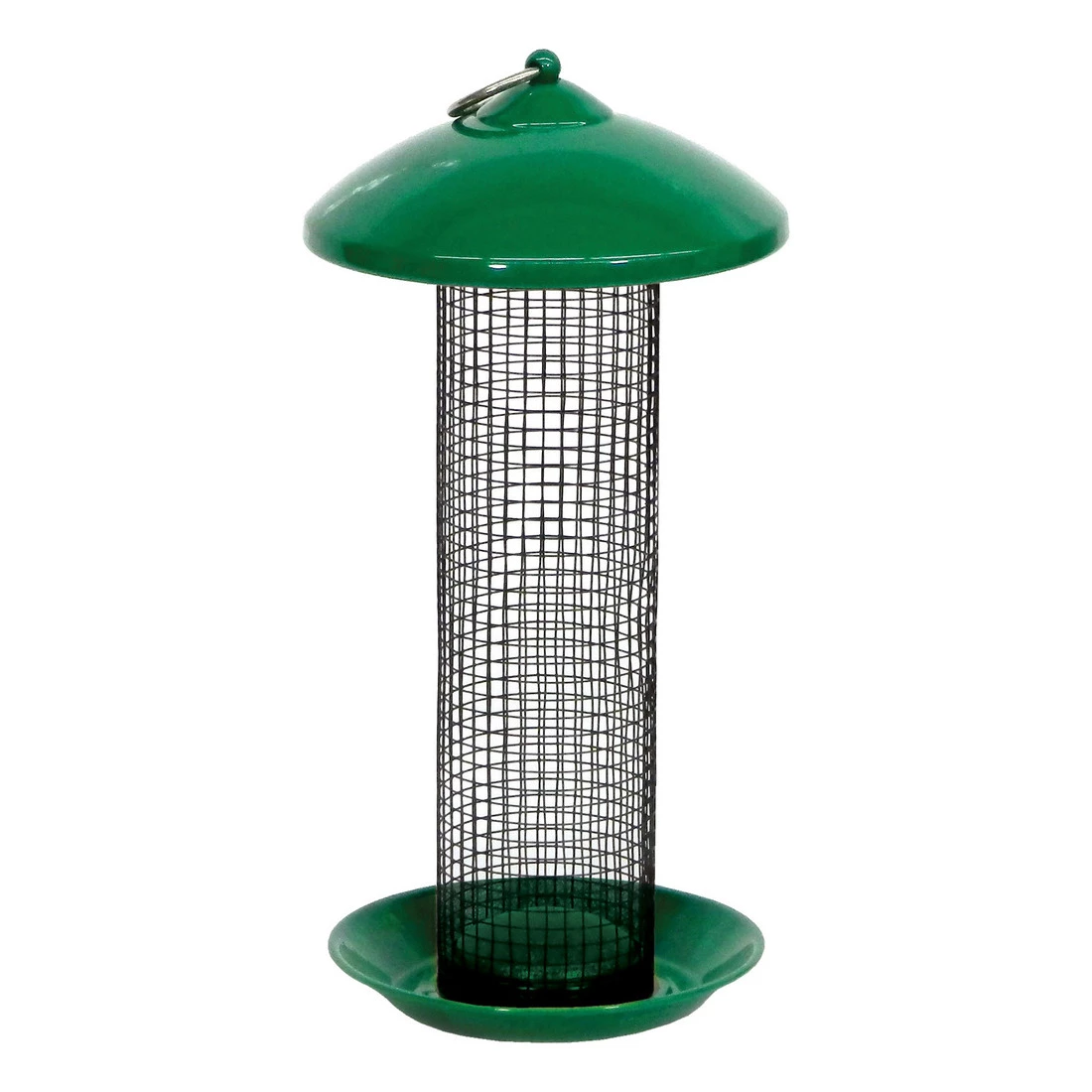 The More Birds^ Mini Seed Screen Feeder attracts Cardinals, Chickadees, Finches and more, providing them with multiple options to feed in their most natural positions, whether clinging to the screen or sitting on the tray, or even upside-down! The feeder features an easy twist-off top and base for convenient filling & cleaning and a screen designed for mixes & large seeds like black oil sunflower. Built-in drainage holes help to keep seeds fresh, while the seed diverter design keeps seeds moving into feeding areas. Powder-coated in a beautiful green color that blends beautifully with the yard, the More Birds^ Mini Seed Screen Feeder is the perfect way to make your birds’ day!