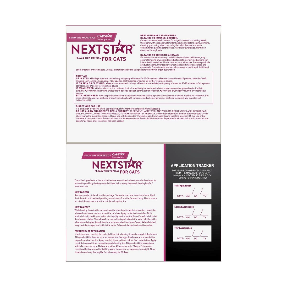 Start killing fleas and ticks on your cat in 15 minutes with NEXTSTAR Flea & Tick Topical for Cats. From The Makers of CAPSTAR (nitenpyram), NEXTSTAR Flea & Tick Topical for Cats formula provides 7-way control by killing fleas, ticks, mosquitoes, chewing lice, and breaks the flea lifecycle by killing flea eggs, flea larvae and preventing flea pupae from developing into adult fleas. Formula previously only sold by vets, this effective cat flea and tick preventive topical is available online and at local retailers without a prescription. Use NEXTSTAR Flea & Tick Topical for Cats to stop active flea and tick infestations and prevent new ones from occurring for up to 30 days. Reapply monthly for year-round protection.