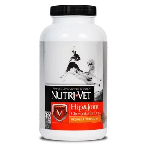 Nutri-Vet Hip & Joint Regular Strength Chewable Tablets provide balanced levels of glucosamine for dogs, plus chondroitin, vitamin C and methylsulfonylmethane (MSM), to help maintain healthy canine joint function and connective tissue. These liver-flavored chewables are veterinarian formulated to provide the best joint supplement for dogs.