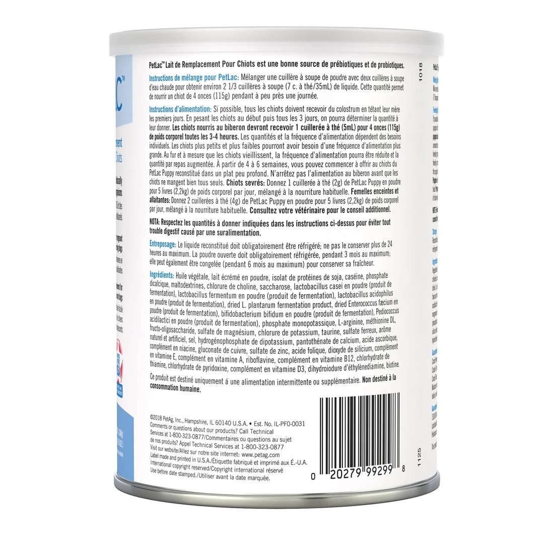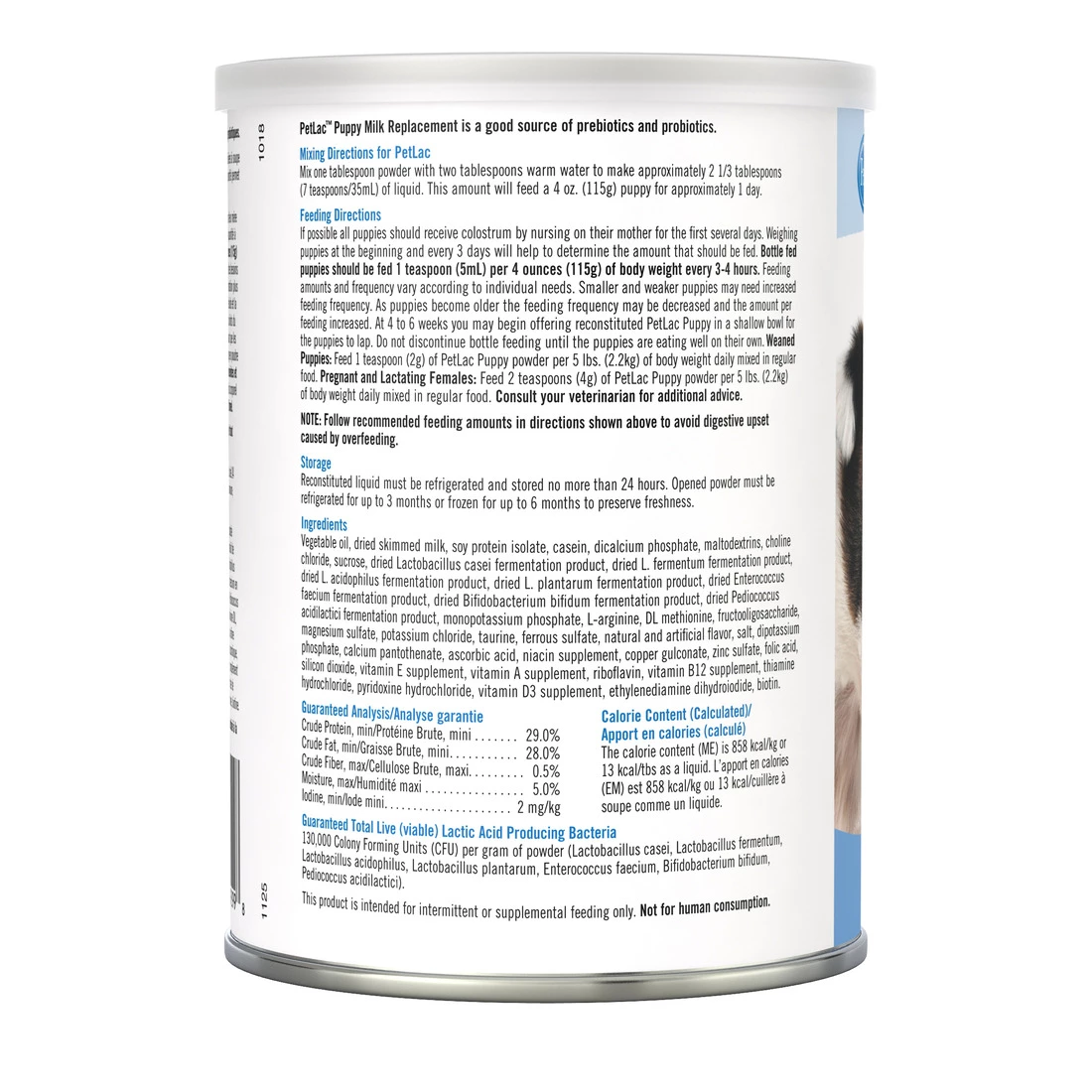 PetLac is an economical milk replacement formula that provides puppies with complete nutrition that is easy-to-digest and is a good match for mother’s milk in protein, fat and carbohydrates. Containing milk and vegetable proteins, PetLac is also fortified with key vitamins, minerals and essential amino acids required for proper growth and development. The PetLac formula is especially beneficial for developing digestive systems, because it contains prebiotics plus probiotics a source of live, naturally occurring microorganisms.