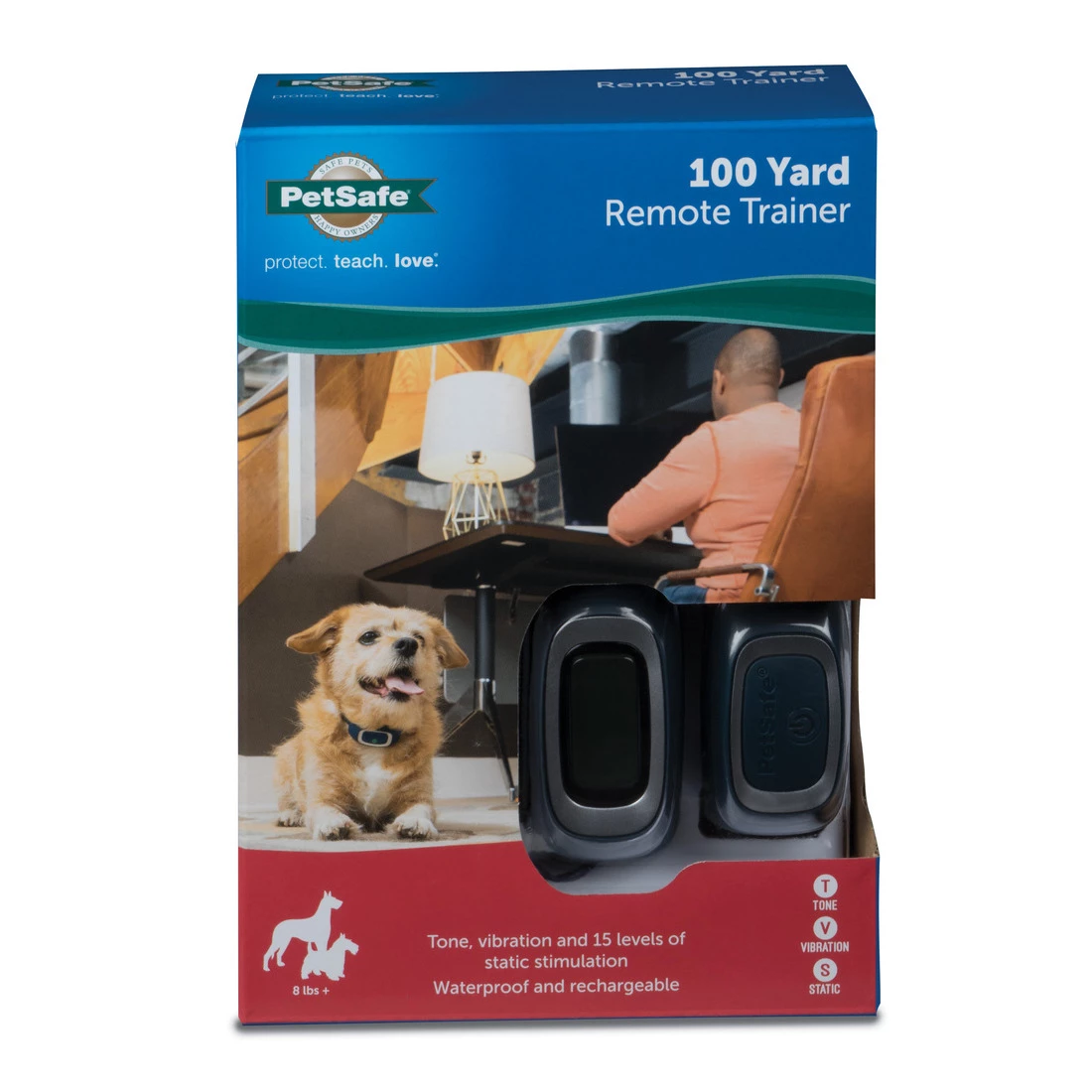 If your best friend has good intentions, but needs some help socially, the PetSafe 100 Yard Remote Trainer allows you to safely teach your dog appropriate behaviors. Great for indoor and backyard training, the remote trainer can help teach new behaviors and improve unwanted behaviors like chewing or barking. With its handheld remote, the systems lets you train your dog within 100 yards using tone (beep), vibration or up to 15 levels of static stimulation. The collar and remote are both waterproof so your pet can maintain his manners rain or shine. You can train 2 dogs with 1 handheld remote with the purchase of a PetSafe Add-A-Dog training collar. They also both quickly charge within 2 hours and have a battery life of up to 40 hours. The training collar fits dogs 8 pounds and up, with neck sizes 6-23 inches. PetSafe brand is here to help you and your pet live happy together.