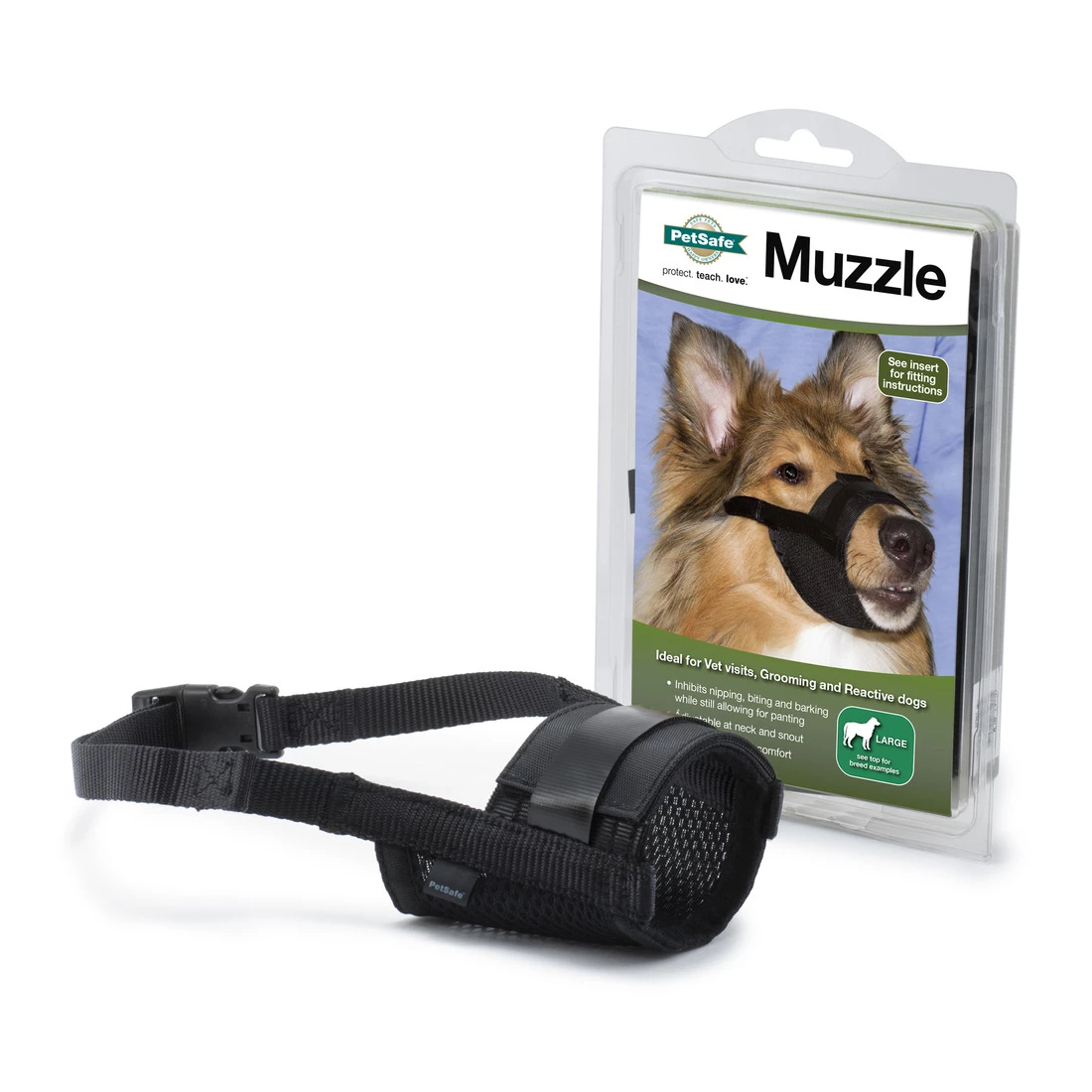 Is your dog reactive? Does he react to dogs, people, or noises by trying to bark or bite? The PetSafe Muzzle is a safety training tool for keeping control of your dog on visits to the vet, groomer, or places that can be scary or overwhelming for your dog. This dog muzzle safely prevents dogs from nipping, biting, and barking while still allowing them to pant. Extra padding will keep your dog comfortable, and the fully adjustable snout and neck strap allow for a perfect fit.