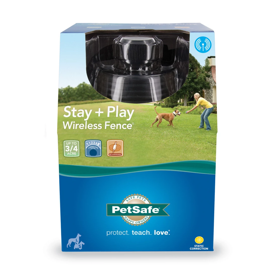 Whether your dog is rolling on his back in the grass or playing a game of fetch, the PetSafe Stay & Play Compact Wireless Fence gives your best friend freedom to safely enjoy his favorite yard activities. There is no need to bury any wires or build a traditional fence, with the turn of a dial our Stay & Play Wireless Fence lets you create a circular boundary up to 3/4-acre. With this wireless fence, you decide how far to extend the boundary to keep your pet secure in their designated space. Place the compact transmitter indoors and setup your new wireless fence in as little as 1-2 hours. If you enjoy camping or traveling in your RV with your dog by your side, you can take this portable wireless fence with you wherever you go. This fence comes with a rechargeable PetSafe Stay & Play Wireless Fence Receiver Collar. The collar has a tone-only mode plus 5 levels of adjustable static correction depending on your dogs temperament. The collar is recommended for pets who weigh 5 pounds or more and fits neck sizes between 6-28 inches. The interchangeable design of the collar strap lets you customize your pets collar using any 3/4-inch non-metallic strap of your choice. If you have more than 1 pet at home, simply purchase as many additional receiver collars as you need so all of your pets can use the same wireless system. PetSafe brand is here to help you and your pet live happy together.