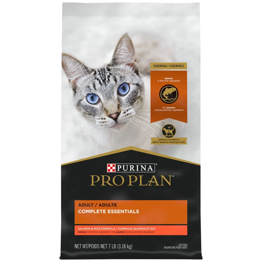Deliver delicious goodness to your cat’s dish when you serve Purina Pro Plan COMPLETE ESSENTIALS Salmon & Rice Formula adult dry cat food. This formula is made with 36% protein to meet a cat’s unique nutritional needs, and it features high-quality protein sources, including real salmon. Guaranteed live probiotics support digestive health, and 25 essential vitamins and minerals plus taurine help to support her overall health and wellness. This dry cat food delivers 100% complete and balanced nutrition for adult cats, so she gets the nutrients she needs to be her best every day. Serve this formula according to the feeding instructions on the product packaging, and adjust the portion sizes as recommended to help your cat maintain an ideal body condition. Giving your cat high-quality nutrition is important to you, and you can find those high-quality meals with Purina Pro Plan. We offer more than 100 wet and dry cat food formulas across four distinct nutritional platforms, including COMPLETE ESSENTIALS, DEVELOPMENT, SPECIALIZED and SENIOR, so it’s easy to find the right formulas to meet your cat’s unique nutritional needs at every stage of life. The advanced nutrition of Pro Plan is the result of more than 90 years of Purina research and is backed by over 500 scientists, including nutritionists, veterinarians and behaviorists, so you can feel confident feeding it to your cat. We proudly manufacture this dry cat food at our Purina-owned US facilities for added peace of mind. To ensure quality and safety, our team of pet experts performs regular checks throughout the manufacturing process. Give your cat the advanced nutrition she needs and the flavor she adores when you offer up a perfectly portioned helping of Purina Pro Plan COMPLETE ESSENTIALS Salmon & Rice Formula adult dry cat food.