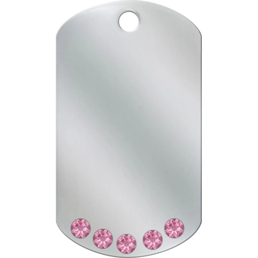 Your pet will catch the eyes of the entire neighborhood while wearing a chrome with pink crystals large military ID Quick-Tag. This tag’s glamor clearly displays your pet’s status of royalty in your family. Personalized tags are a great way to set your pet apart from the Animalia crowd, while showcasing an aspect of their personality. Engraved tags ensure that your pet never gets lost without the information needed for you to be contacted. Tag can be engraved with pets name, home address, and/or phone number (yours, not theirs). Alternatively, inscription can be instructions, a catchphrase, or a custom message.