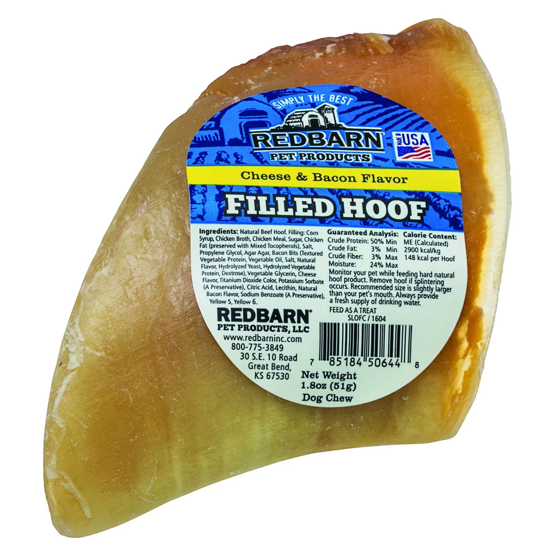 Redbarns Filled Hooves are natural a cow hoof stuffed with highly palatable fillings. Chewing tough natural chews is a great way support your dogs dental health and help reduce their level of stress and boredom! Try our Cheese & Bacon flavor today!