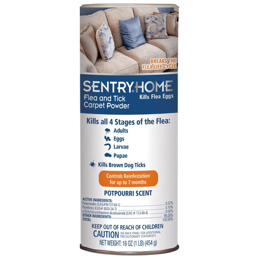 SENTRY HOME Flea and Tick Carpet Powder kills all four life stages of the flea: adults, eggs, larvae and pupae. It also kills brown dog ticks. This powder breaks the flea life cycle and controls reinfestation for up to seven months. Protect your pet, your home and your family from the biting, itching and diseases that fleas and ticks can transmit.