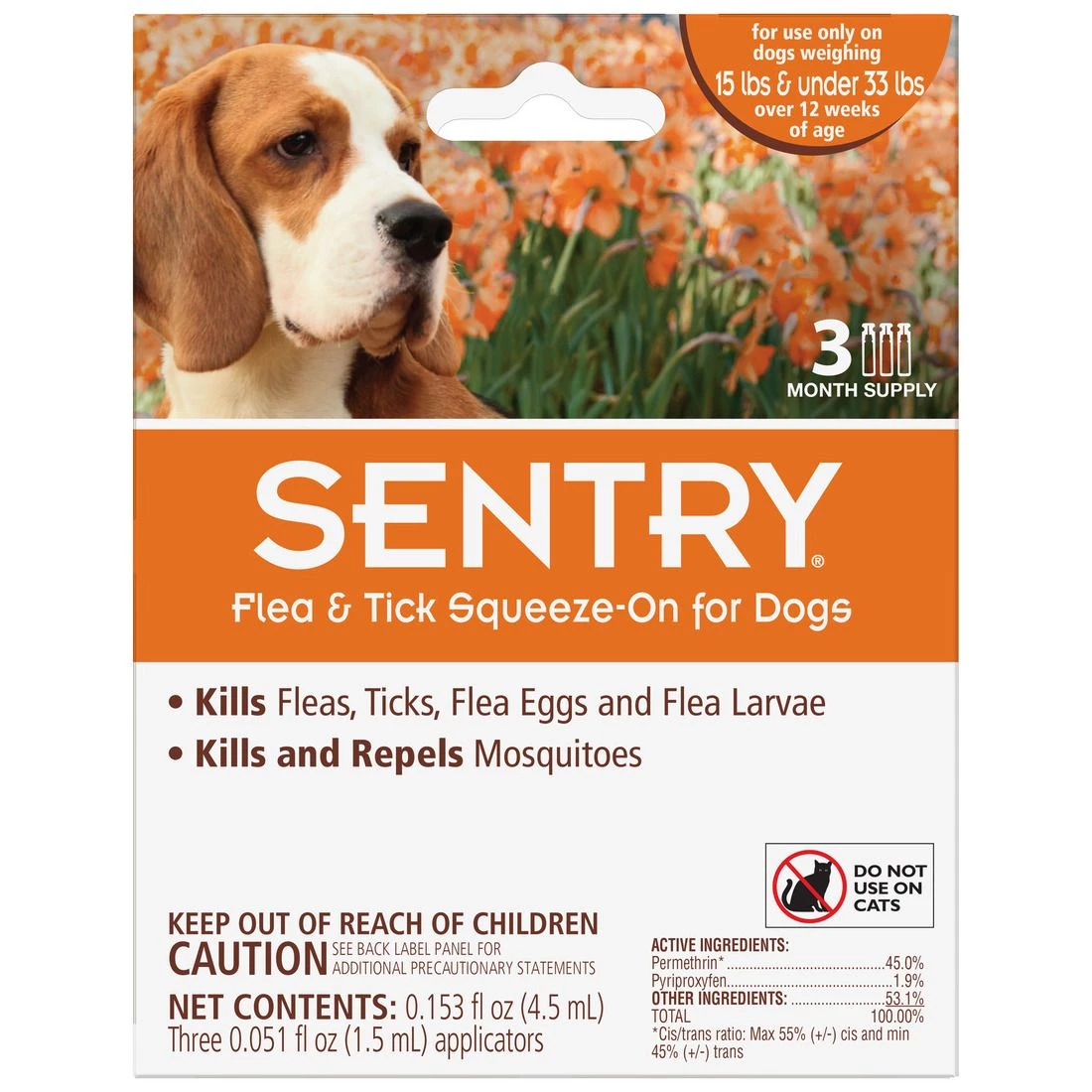 SENTRY Flea and Tick Squeeze-On for dogs kills and repels fleas and ticks for up to a month. It also kills flea eggs and larvae for up to four months. It even kills and repels mosquitoes! Each box contains a four month supply.