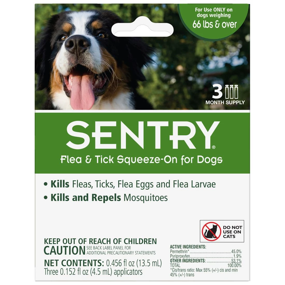 SENTRY Flea and Tick Squeeze-On for dogs kills and repels fleas and ticks for up to a month. It also kills flea eggs and larvae for up to four months. It even kills and repels mosquitoes! Each box contains a four month supply.