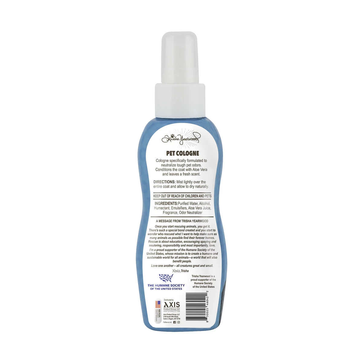 Trisha Yearwood’s Pet Cologne is specifically formulated to neutralize tough pet odors. Conditions the coat with Aloe Vera and leaves a Fresh scent.