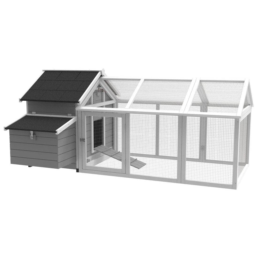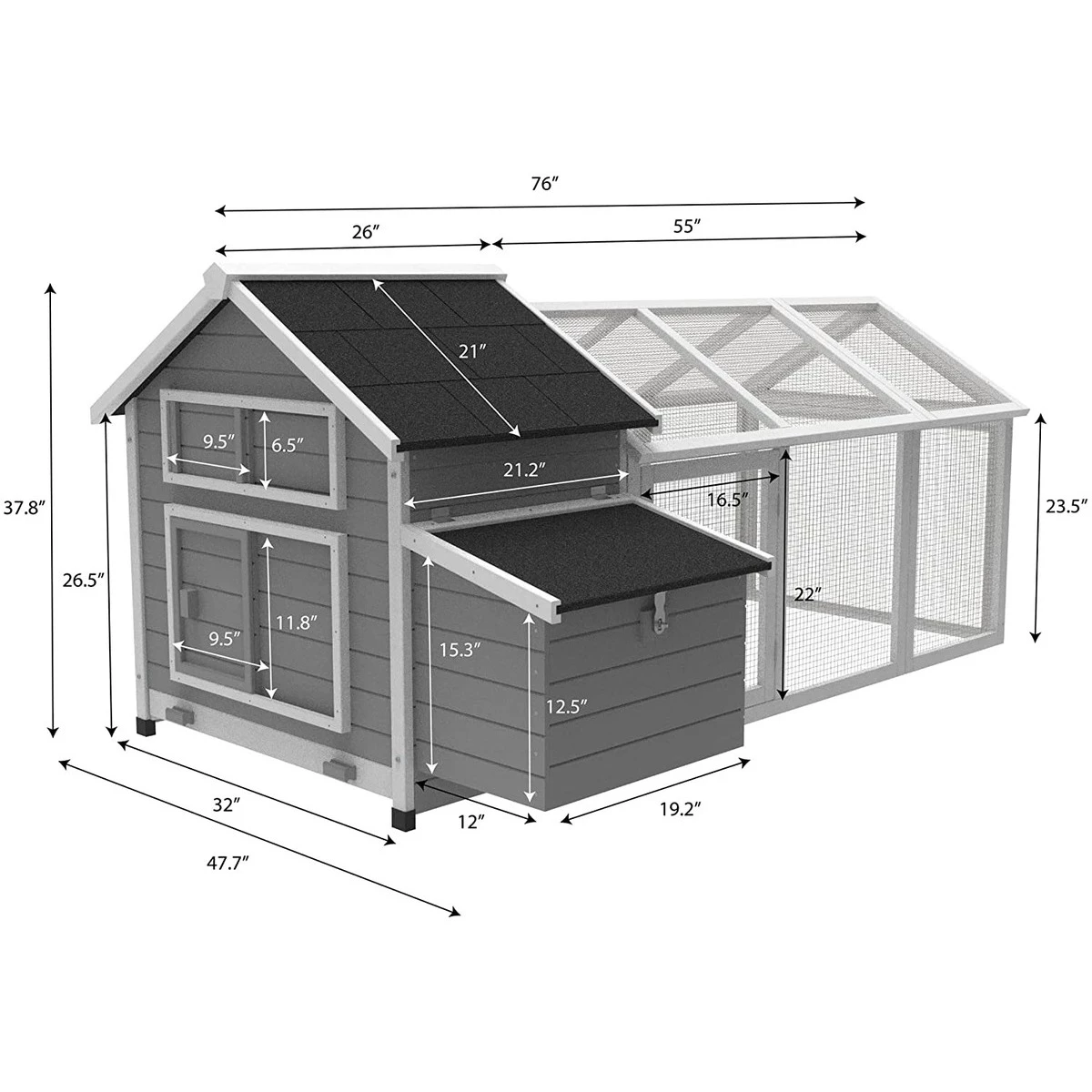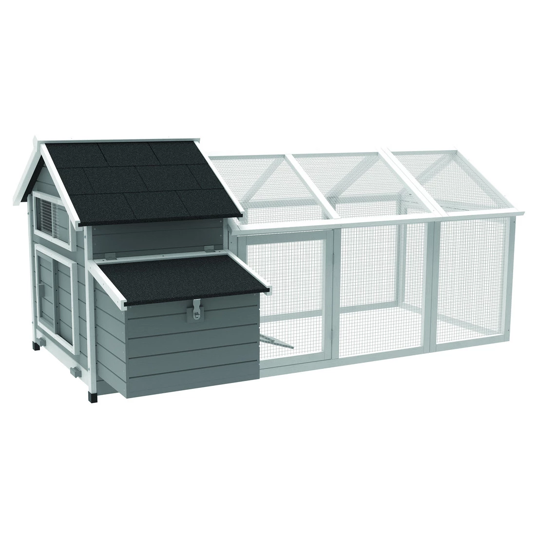 Easy to Clean Pull Pan. Large Protected Playpen. Comes with 2 Nest Boxes. Waterproof Shingle Roof. Adds living space and Free Range Environment