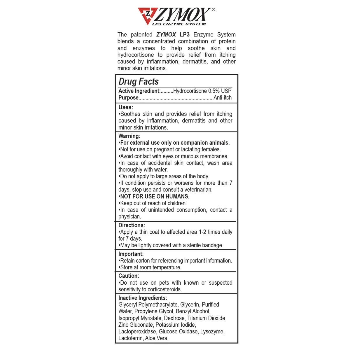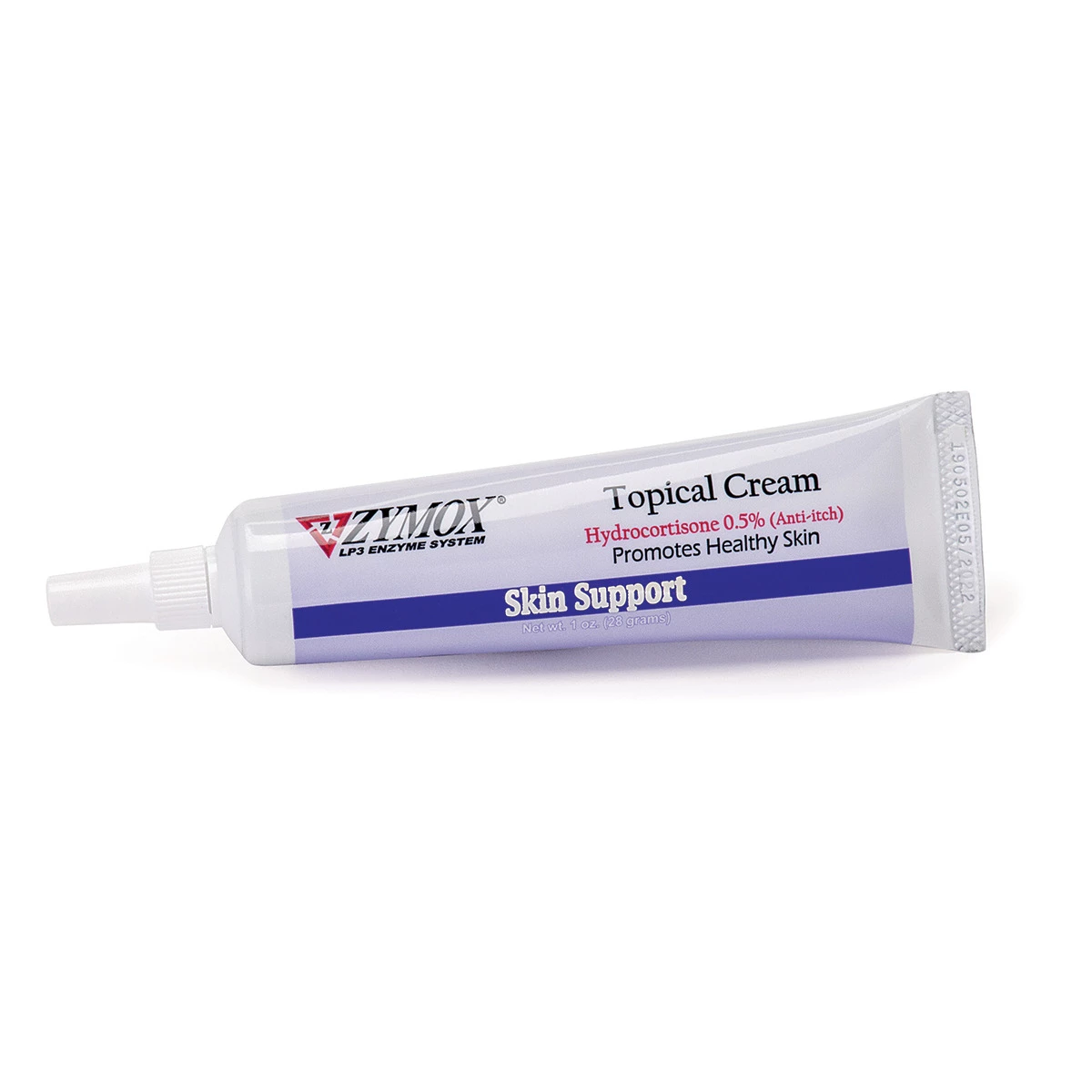 Veterinarian Recommended. ZYMOX Topical Cream with 0.5% Hydrocortisone Promotes healthy skin and provides relief from itching caused by inflammation, dermatitis, and other minor skin irritations. ZYMOX Topical Cream contains the patented LP3 Enzyme System which blends a concentrated combination of protein, enzymes plus skin soothing aloe vera and 0.5% hydrocortisone for itch relief. The Cream features a catheter tip for direct application. Ideal for areas around the face, paws, and body folds.